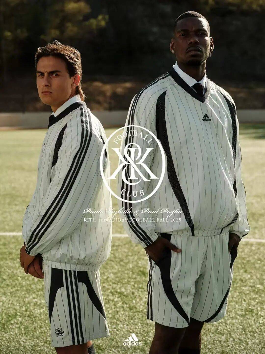 第四套单品的核心设计亮点,在于双方品牌标识的创意融合:醒目亮眼的 KITH 大字符,与 Adidas 标志性的条纹元素巧妙搭配,视觉上极具冲击力,品牌辨识度直接拉满!